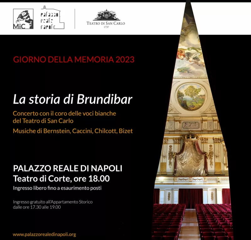 In occasione del Giorno della memoria 2023, venerdì 27 gennaio alle ore 18.00, presso il Teatro di Corte del Palazzo Reale si terrà un concerto dal titolo La storia di Brundibar, eseguito dal Coro di Voci Bianche del Teatro di San Carlo, diretto da Stefania Rinaldi.