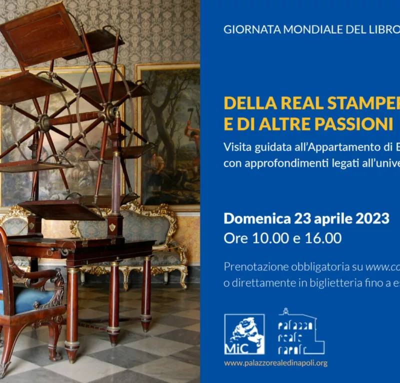 In occasione della ‘’Giornata mondiale del libro e del diritto d'autore’’, domenica 23 aprile, alle ore 10:00 ed alle ore 16:00, la visita al Palazzo Reale di Napoli si arricchisce di approfondimenti legati all’universo del libro e della lettura. La fondazione della Real Stamperia Borbonica, la nota passione della regina Maria Carolina d’Austria per la lettura saranno alcuni dei temi proposti durante l’articolato percorso che si concluderà con un focus dedicato all’esemplare di leggio rotante – appartenuto alla regina Maria Carolina ed opera di Giovanni Uldrich – oggi esposto nell’Appartamento di Etichetta del Palazzo Reale.
