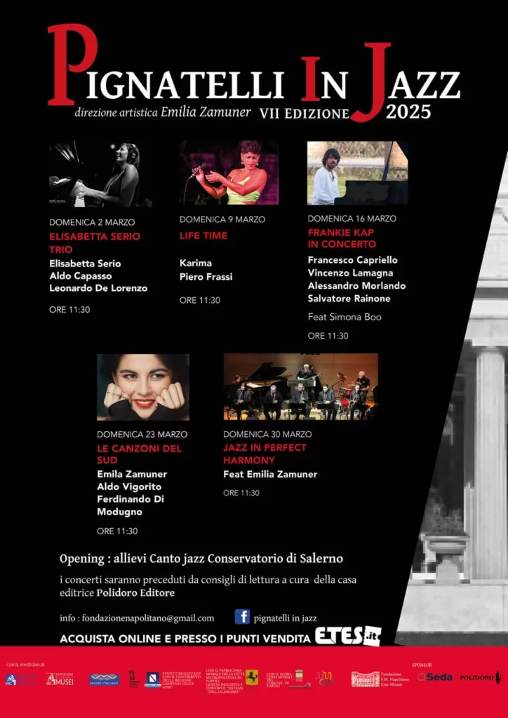 Si inaugura domenica 2 marzo 2025 alle ore 11.30, nella suggestiva Veranda Neoclassica di Villa Pignatelli, la settima edizione di “Pignatelli in Jazz”, manifestazione ideata e diretta dalla cantante jazz Emilia Zamuner, organizzata e promossa dalla Fondazione F.M.Napolitano e realizzata con il contributo del Fondo Unico dello Spettacolo e della Regione Campania. Il concerto del 2 marzo è a cura della pianista e compositrice Elisabetta Serio, che vanta collaborazioni con alcuni dei grandi nomi del panorama musicale italiano ed internazionale, uno tra tutti Pino Daniele. A Villa Pignatelli si esibirà in trio con Aldo Capasso al contrabbasso e Leonardo Di Lorenzo alla batteria, e dedicherà il concerto ad un suo allievo tragicamente scomparso di recente eseguendo brani del suo prossimo album.